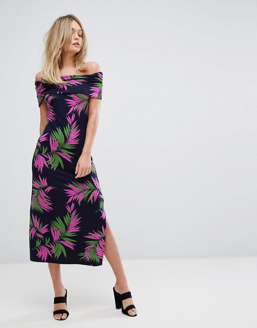 Dress by Warehouse Soft-touch jersey Printed design Bardot neck Off-shoulder style Slim fit - cut close to the body Machine wash 97% Viscose, 3% Elastane